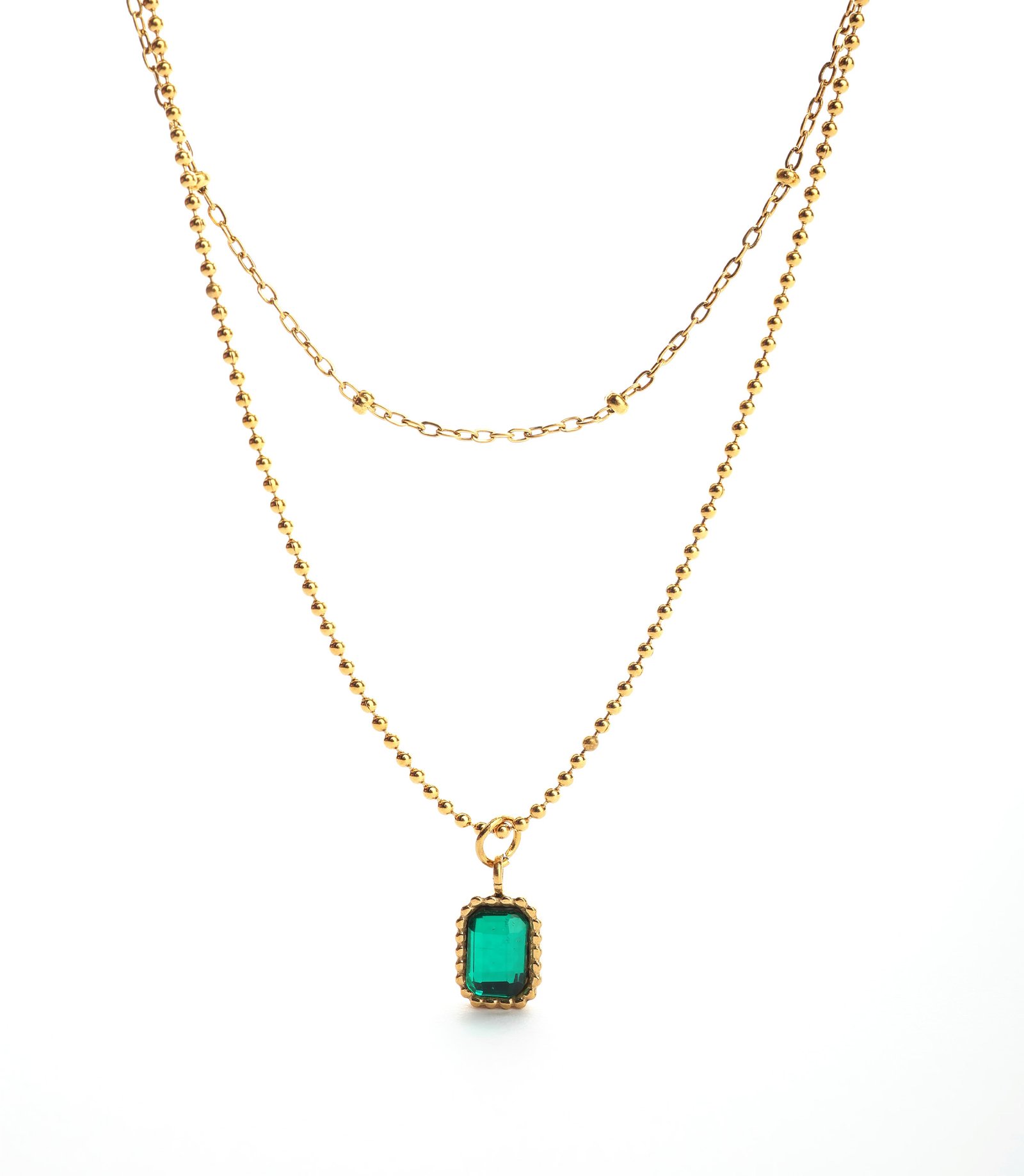 שרשרת כפולה בעיצוב מרשים, המשלבת שרשרת חוליות עדינה ושרשרת כדורים שבמרכזן תליון אבן ירוקה ומהפנטת. השרשרת עשויה Stainless Steel איכותי, מה שמבטיח עמידות מלאה במים ושמירה על הברק לאורך זמן. זהו תכשיט וינטג' יוקרתי, שמוסיף עומק, צבע וסטייל בלתי מתפשר לכל הופעה – מערב נוצץ ועד ללוק יומיומי מתוחכם.
